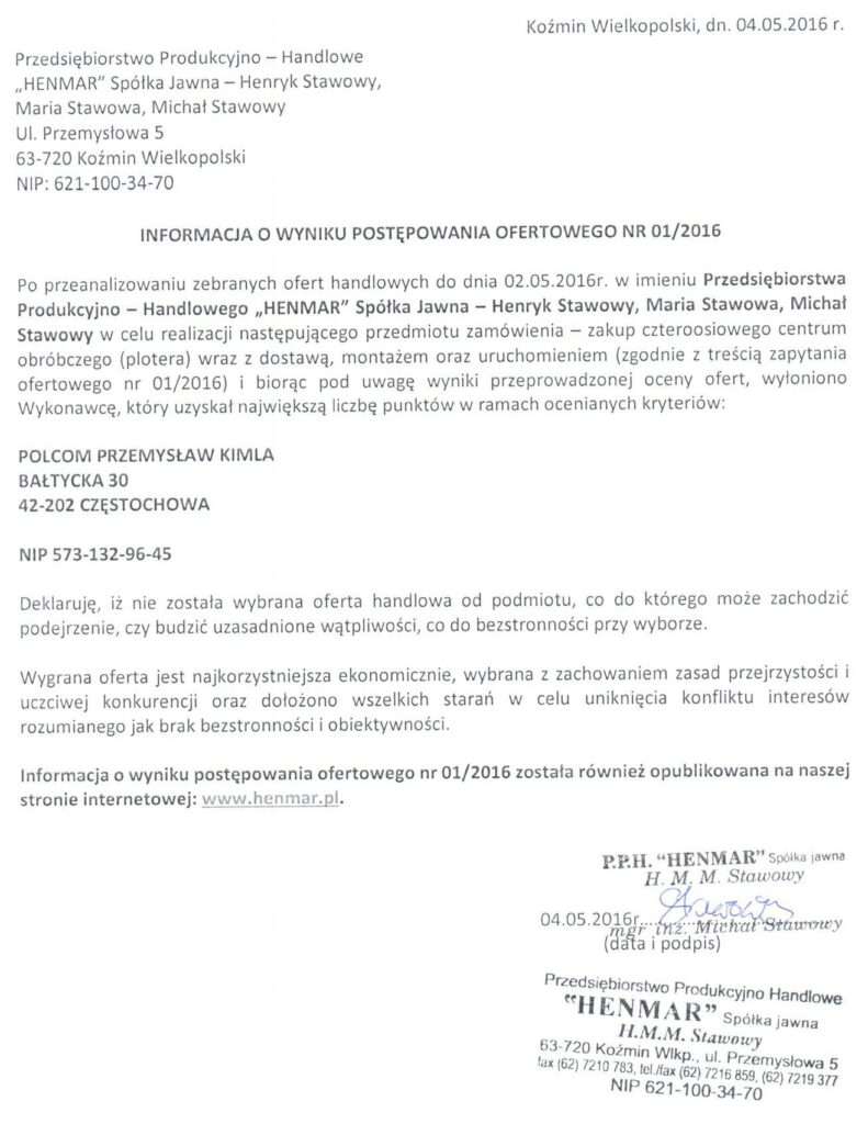 W związku z planowaną realizacją przez Przedsiębiorstwo Produkcyjno – Handlowe „HENMAR” Spółka Jawna – Henryk Stawowy, Maria Stawowa, Michał Stawowy (zwanym dalej: Zamawiającym) projektu w ramach poddziałania 1.5.2 „Wzmocnienie konkurencyjności kluczowych obszarów gospodarki regionu” Wielkopolskiego Regionalnego Programu Operacyjnego na lata 2014-2020 o roboczym tytule „Wzrost konkurencyjności P.P.H. HENMAR Sp. J. poprzez inwestycję w Koźminie Wlkp. Polegająca na wdrożeniu innowacyjnej metody lakierowania proszkowego oraz zakupie plotera do wytwarzania elementów wyposażenia kabin oraz modeli do formowania próżniowego” (zwany dalej: Projekt), zwracamy się z prośbą o przedstawienie oferty na następujący przedmiot zamówienia: